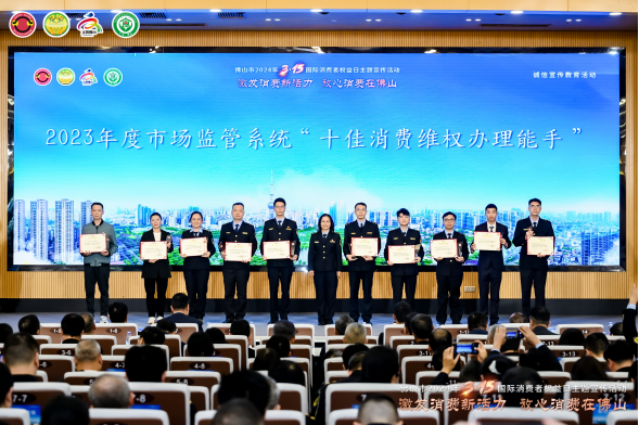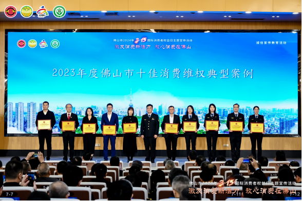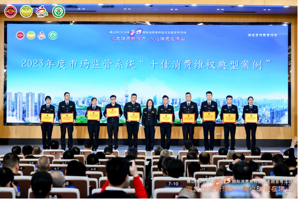 活動(dòng)現(xiàn)場(chǎng)還為2023年度佛山市及市場(chǎng)監(jiān)管系統(tǒng)的十佳消費(fèi)維權(quán)典型案例承辦單位、十佳消費(fèi)維權(quán)辦理能手,“放心消費(fèi)承諾”“線下無(wú)理由退貨承諾”單位,以及市級(jí)消費(fèi)教育基地單位等授牌。