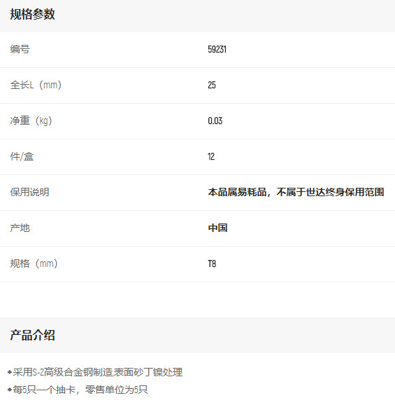 首頁>產(chǎn)品中心>螺絲批>旋具頭>世達5件套6.3MM系列25mm長花型旋具頭T8