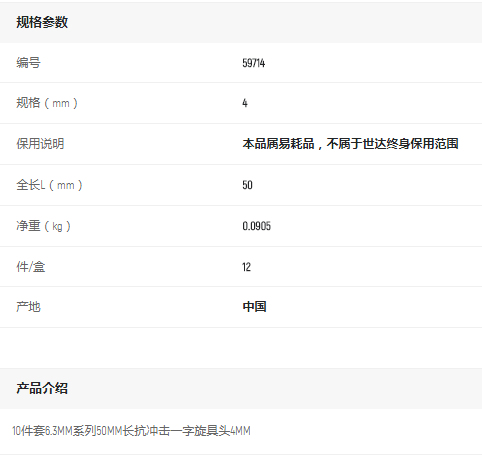 首頁>產品中心>螺絲批>旋具頭>世達10件套6.3MM系列50mm長一字旋具頭4MM