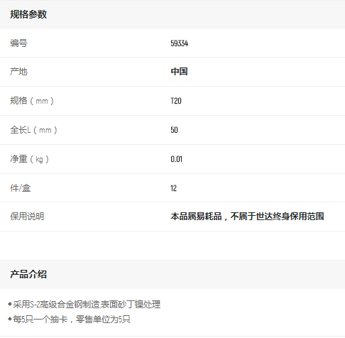 產(chǎn)品名字:世達5件6.3mm系列50mm花型旋具頭T20